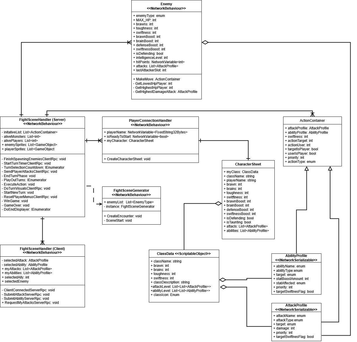 The client instances transmit the players’ commands, which get added to the ‘initiative list’ (a list of actions and related information such as user, target and action priority). Once all players have submitted actions (or the one-minute timer has expired), the FightSceneHandler requests an action from each Enemy before beginning action execution.
