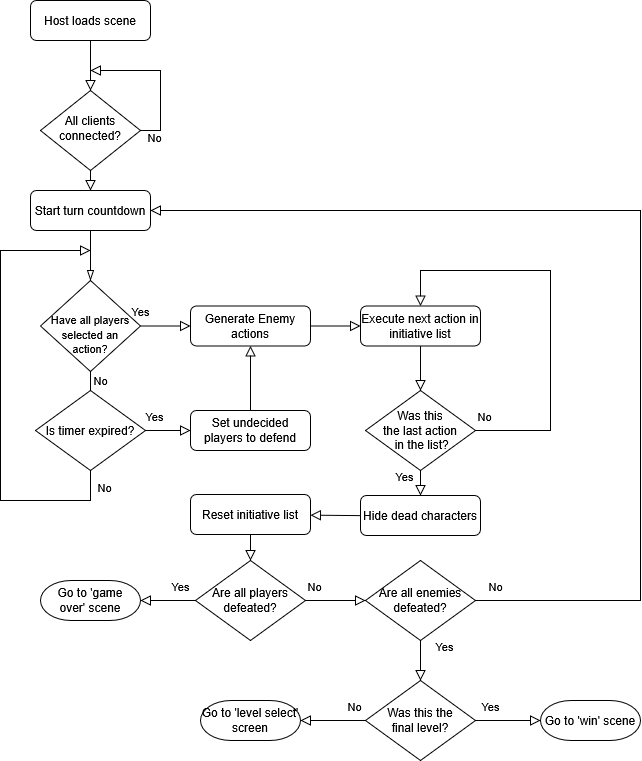 The most complex aspect of the game flow is the fight scene. This is where the turn-based combat between the players and enemies is executed. Much of the flow of logic is controlled by a GameObject called the FightSceneHandler. The following flowchart shows how the loop continues until either the players or the enemies are defeated.