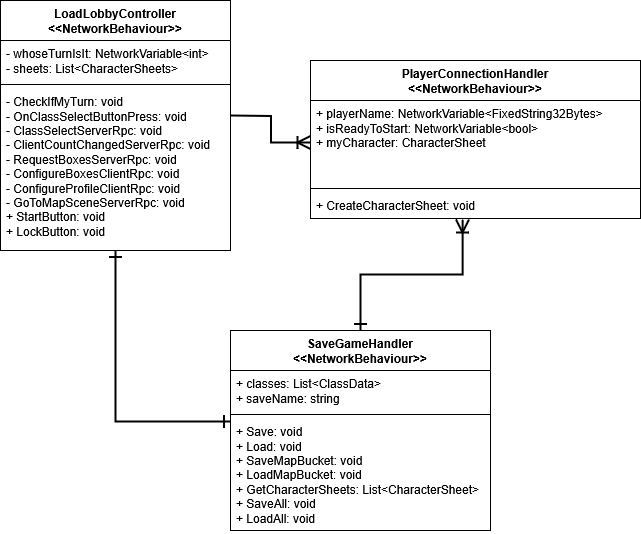 The LoadLobbyController takes the list of loaded CharacterSheets from the SaveGameHandler and presents them to the players. Each player in turn gets to select one of the sheets, which is then copied to that player’s PlayerConnectionHandler serverside. It also changes the playerName NetworkVariable to the saved character name.