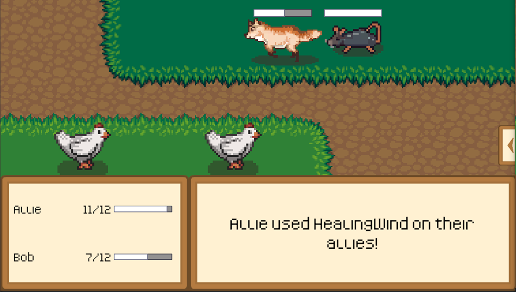 The server’s FightSceneHandler iterates through the sorted list and executes each action in turn, applying effects such as damage or powering up the targeted characters. It also sends RPCs to every client to make them display text describing each action, so the players can follow along with the turn and understand what is happening. Once each action has been described, the turn ends, and the server’s FightSceneHandler updates its lists of alive player characters and enemies, removes the sprites of defeated characters, and tells the clients of surviving characters to display the combat menu again. The cycle then repeats until every enemy has been defeated, and the players can continue to the next level (or to the victory screen, if it is the final boss fight), or until all the players have been defeated, and a ‘game over’ screen is displayed.