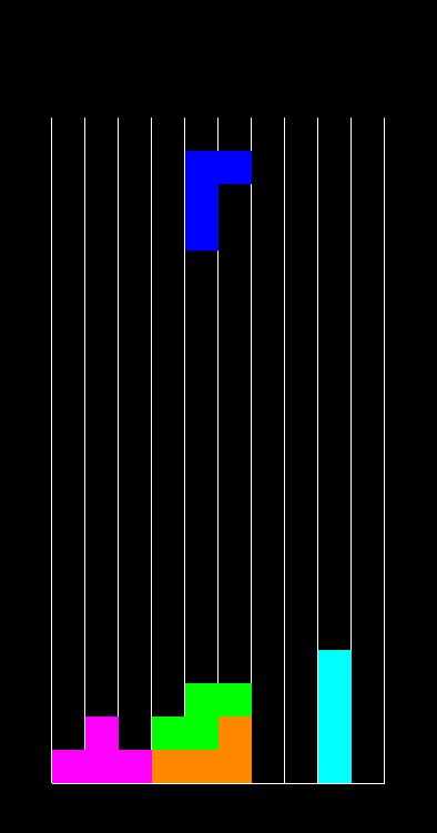 As discussed above, the front end of the program is mostly concerned with taking player inputs and drawing a representation of the grid on the screen. It also handles the game’s ticks, which happen every 0.6 seconds. If a piece is stationary for a whole tick, it will drop by one row, and if the bottom of the piece is touching something for a tick, it is locked in place and a new controllable piece spawns.