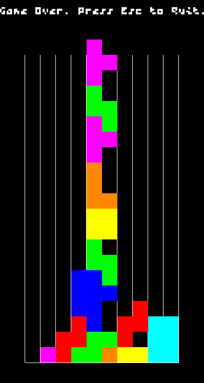 Once any player input is handled, the game checks to see if the current active piece can be moved down a row. If it can, the piece is moved down. If it cannot, the piece is therefore in its final position. If this final position is in the two rows above the grid walls, then the player has losed and the game is over. After all of the logic has concluded, the game draws the grid walls and all of the filled spaces on the screen, before the logic loop restarts for the next frame.